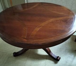 Suite déménagement je vends une belle table ronde en merisier patine antiquaire avec incrustations noyer Diamètre 115 cm, 2 rallonges. Position ovale possible. A enlever à Tr