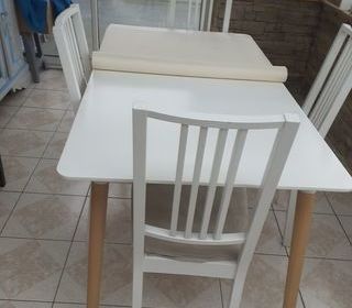 Table de salle à manger blanche avec pieds en bois Longueur : 150 cm Largeur : 80 cm Hauteur : 75 cm Avec bullgomme et protection transparente