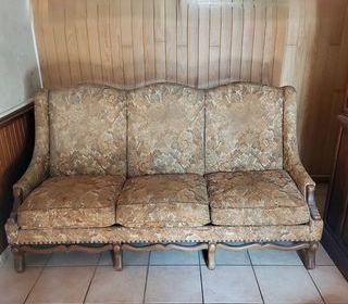 CHAISE EN BOIS DE NOYER ET VELOURS ROUGE, VERT ET JAUNE. HAUTEUR DOSSIER DE CHAISE DE 110 cm . HAUTEUR D'ASSISE DE 45,5 cm . LARGEUR ASSISE DE 48 cm . LARGEUR DOSSIER DE