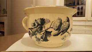 Très joli pot de chambre beige très clair avec ses dessins bleu-vert très foncé de la marque connue terre de fer HB et Cie de Marseille. Peut servir30 vide ou pour mettre des fleur