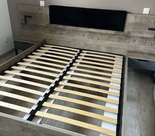 Vends lit 160cm x 200cm , la façade est en bois et velours noir , avec sommier neuf, chevets et petites lampes intégrées. Le tout fait 270 cm de longueur
