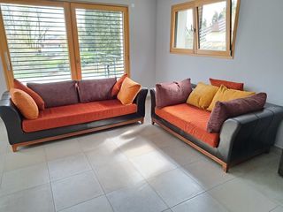 Je vends cet ensemble de 2 canapés 2 et 3 places Mobilier de France de structure en bois massif. Avec leurs coussins multicolores en tissu velours, leur assise en mousse haute dens