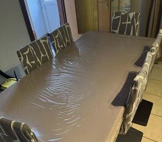 Je vends une grande table moderne en bois marron et blanc, extensible, idéale pour accueillir famille et invités. Elle est protégée par une nappe GumGum, une nappe par€'dessus et u