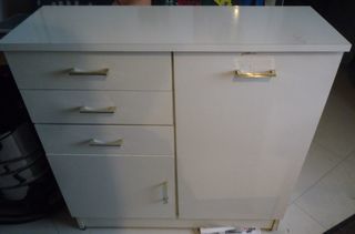 Meuble de salle de bains avec panière a linge intégrée sur le cote droit blanc très pratique contenant plusieurs tiroirs Dimensions : Largeur 81 cm Profondeur 28 cm Hauteur 8
