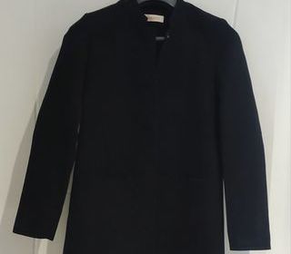 Magnifique veste noir avec 3 boutons argent fer cheval pour la fermer équipée de 2 poches Intérieur doublé en rouge Porté 1 fois passée au nettoyage Comme neuve