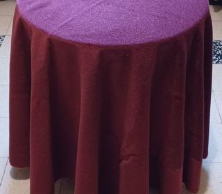 Petite table d'appoint, ronde, diamètre 50 cm, hauteur 64 cm avec grande nappe velours bordeaux.