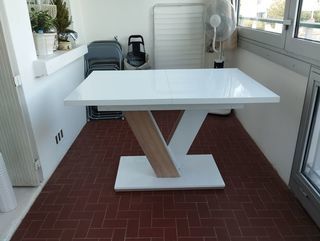 Table avec plateau rectangulaire blanc brillant et pied central en forme de V associant une finition bois clair et du blanc. Dim: 120x80 HT 76. Avec une rallonge de 40. Neuve.