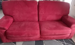 Canapé 2 places ( Mobilier de France) en tissus velours rouge clair très confortable. 206 cms de large avec 4 coussins ( assise et dossier) avec fermeture éclair, de 20 cms d'ép
