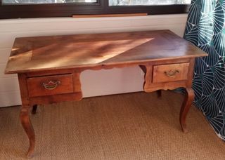 Bureau ancien en bois massif, couleur marron foncé, en bon état général. Il dispose de 2 tiroirs fonctionnels. Dimensions : . Longueur : 142 cm . Large