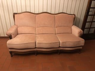 Salon comprenant canapé trois places et deux fauteuils en bois et velours rose pale en excellente état. Assise rigide