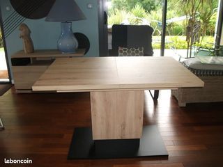 Table contemporaine en bois clair 1,20 x 0,80 (1,80 m avec rallonges) avec un socle large de couleur noire et un support métallique gris. Convient à un salon ou une salle à manger.