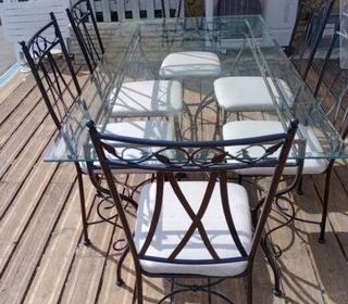 Table plateau en verre 94 cm x 175 cm, 75 cm de hauteur et 6 chaises recouvertes récemment d'un tissu. Idéal pour véranda Secteur gendarmerie de St ciers sur gironde