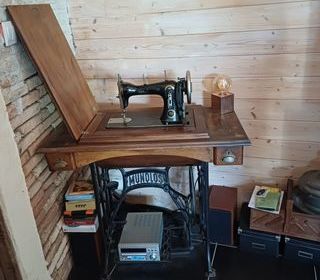 Meuble machine à coudre avec machine intégrée escamotable marque MUNDLOS, table chêne 46 x91 cm, empiétement fonte noir Hauteur totale 77cm + plateau 5 cm A venir récupérer sur
