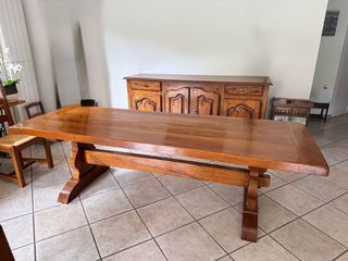 Je vends cette salle à manger pour cause de déménagement. Elle est composée d'une Table de salle à manger monastère en chêne massif, faite artisanalement, démontable + 6 chaises +