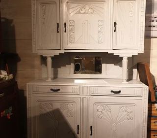 Ancien vaisselier art deco de qualité en bois merisier années 30-40 relooke en gris nuage céruse blanc et ciré et l intérieur en vert pétrole/gris nuage. Miroir biseauté d origine