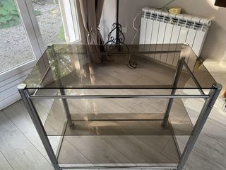 Table télévision avec plateau en verre fumé et étagères en verre sur roulettes en parfait état À venir chercher sur place Pas de livraison