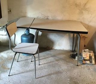 1 table formica longueur 1m avec 2 rallonges de 30cm, largeur 70cm, 4 chaises et 1 tabouret. Le tout en formica blanc. Bon état général. Prix à débattre.