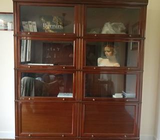 Bibliothèque fermée vernie façon acajou : Longueur 160 cm Profondeur 36 cm Hauteur 198 cm 8 vitres coulissantes dont 2 opaques, 2 tiroirs. À prendre sur place.