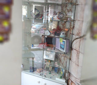 Grande vitrine d'angle avec cinq étagères posée sur un caisson à roulettes. Idéal pour la présentation d'objet, de produit ou autres.