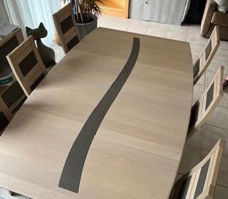 Dimensions : 175*110 - Rallonge intégrée : 60 - Hauteur : 76 Couleur Chêne clair 6 Chaises totalement assorties en simili cuir - Longueur 46 Hauteur 105 Profondeur 43 Attestatio