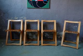 Quand la chaise d'appoint se fait belle, on guette l'arrivée des copains et les soirées improvisées! Cette série de 4 chaises pliantes est tout en bois, de teinte claire. Les ligne