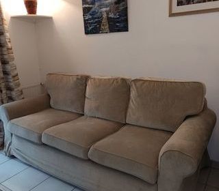 Canapé trois places en très bon état de 1m par 2,23m. La bonne assise et le soutien du dos permettent tous les usages, y compris pour regarder la télévision, assis ou allongé. Vas