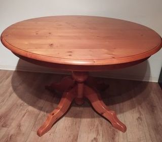 Vends table à manger ronde, 120 cm de diamètre et pouvant recevoir 10 à 12 convives grâce à ses deux rallonges, ses deux pieds et deux tapis de protections, l'un rond de 120 cm de