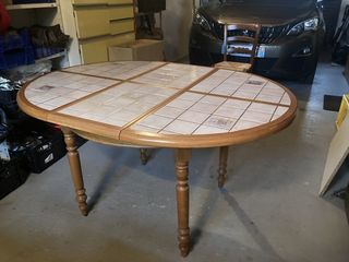 Table en bois ronde dilater 105 cm, dessus petits carreaux couleur beige clair, avec allonges incorporées. Dimensions avec allonges 105 cm x 138 cm
