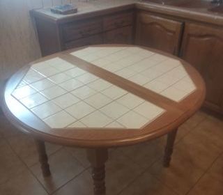 Nous vendons un ensemble table et chaises cuisine comprenant une table ronde en pin massif finition carrelées idéal pour poser des plats chauds dessus sans en abimer le bois avec 2