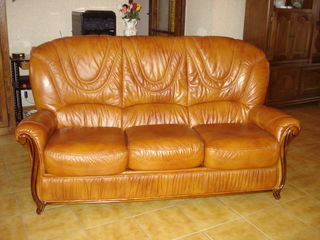 Nous vendons notre ensemble Canapé 3 places cuir et bois de bonne facture ( cuir véritable couleur fauve ) qui est en excellent état ( comme neuf ) acheté à Mobilier de France il y