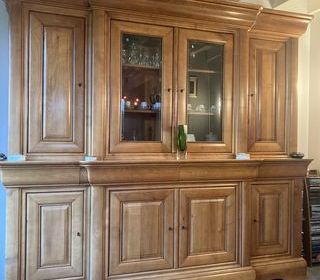 Buffet vaisselier en bois de merisier en deux parties avec portes pleines et vitrées, composé de plusieurs rangements et étagères, couleur bois clair. Hauteur 230 cm, largeur 250 c