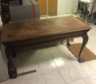 Très jolie table de la Maison du Monde Sculpter sur le dessus ,en bois pied original excellent état !voir photos !1m10 sur 1m10.