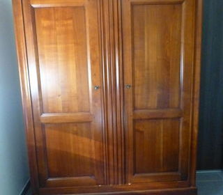 Voici une armoire 2 portes en merisier doré, massif de style Louis Philippe. L'aménagement intérieur est de 3 étagères sur toute la largeur. les étagères sont modulables étant mon