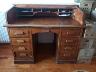 Le tout en bon état, demande nettoyage et traitement bois ancien. Ce bureau style américain années 30/40 est très fonctionnel, il se compose de 3 parties à assembler : le plateau (