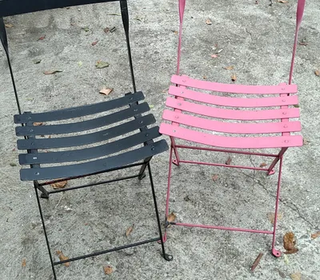 Vend 16 chaises en fer dont 6 noires plus 10 roses plus une table en fer carré de 70 x 70 le tout pour 360 euros