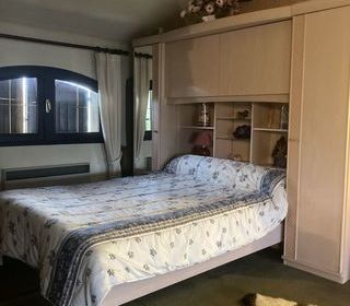 Lit pont, en 140, en bois teinté rose avec penderie, miroir et étagères. dimensions du meuble largeur 145 cm, hauteur 195 cm