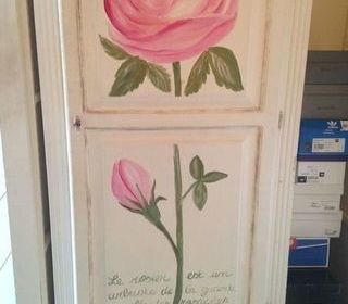 - Lit : 1 personne ½ - dimensions : 120 x 188 cm ? matelas, sommier et tête de lit blanche, - Table de chevet en bois blanc peint motifs fleurs ? dimensions : Hauteur : 51 cm L