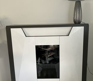Meuble blanc laqué structure bois ébène noir 1porte en verre 1 tiroir 2 portes bois laqué blanc longueur 140 hauteur 140 profondeur 44 meuble comme neuf prix 400 euros.