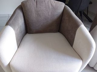 Bonjour. Je vends 2 fauteuils cabriolets pivotants en très bon état. L 75 , H 80 , P 75. Ils sont recouverts de tissus écru et marron, structure bois massif. Provenance maga