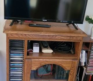 meuble de télévision en chêne comprenant 1 étagère - 1 porte vitrée avec deux étagères - un espace DVD le plateau supérieur s'avance et pivote