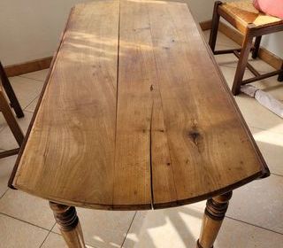 Ensemble table et chaise en merisier Table diamètre 125 cm avec 2 rallonges en plus de 50cm chacune Le tout en parfait état La table seule 100€ Chaises 100€ dimension table p