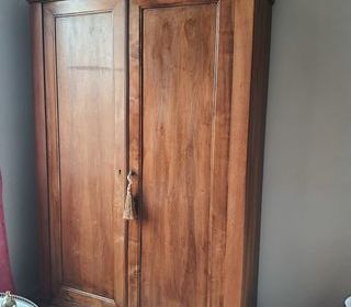 Armoire ancienne pour rangement linge ou vaisselle, en merisier, 2 tiroirs intérieurs en Noyer et 1 tiroir bas d'armoire. Bonne capacité de rangement. Bois fendu côté droit - glis