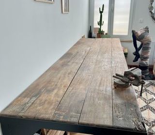 Grande console / établi robuste en bois massif 2,62 m x 77 cm Hauteur 89 cm Épaisseur du bois 5,5 cm Très stable. La partie bois se dévisse du cadre métallique pour le trans