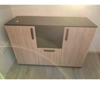 Vends un meuble télé hifi vidéo qui peut également être utilisé en meuble informatique , en merisier massif mouluré de France. Il est équipé sur la partie haute de 2 portes couliss