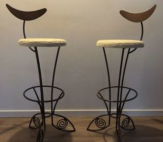 Vends 2 Chaises hautes/ tabourets de bar de marque Pescatore -référence Farfalla -(du créateur sétois François Liguori) en fer forgé avec assises en corde. Hauteur totale : 105 cm