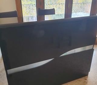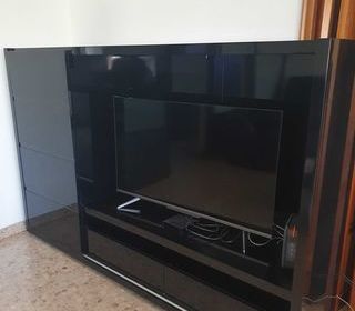Meuble TV en laqué noir avec un espace rangement. très bon état Largeur : 1,95 m Hauteur : 1,26 m Profondeur : 45 cm