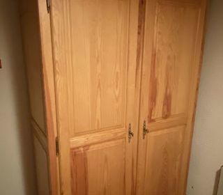 Armoire en pin massif 2 portes avec 1/3 étagères et 2/3 penderie en très bon état. Dimensions 1,40L X 0,64l X 2,13h