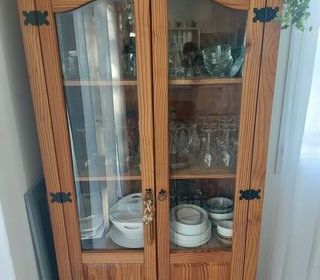 Je vends ce vaisselier ou meuble vitrine en pin massif. - Matériau : Pin massif - Couleur : Bois naturel traité à l'huile de lin . - Aménagement : 2 portes vitrées, 4 étagères i