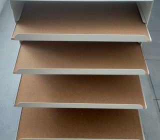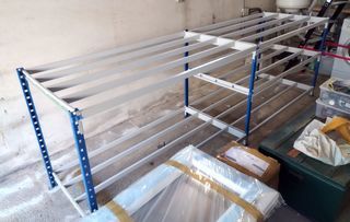 Cinq niveaux de 150 x 80 cm répartis sur 2 étagères reliées. Hauteur du plus haut niveau : 100 cm. Niveaux en plaque Isorel d'épaisseur 3 mm renforcés avec des profilés métalliqu