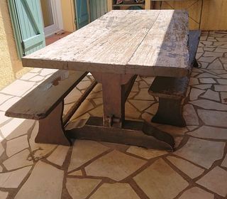 vends table en bois avec 2 bancs pour intérieur ou extérieur Etat moyen Actuellement elle a été poncée mais non repeinte A rénover Longueur : 2m40 Largeur : 1m04 A venir che
